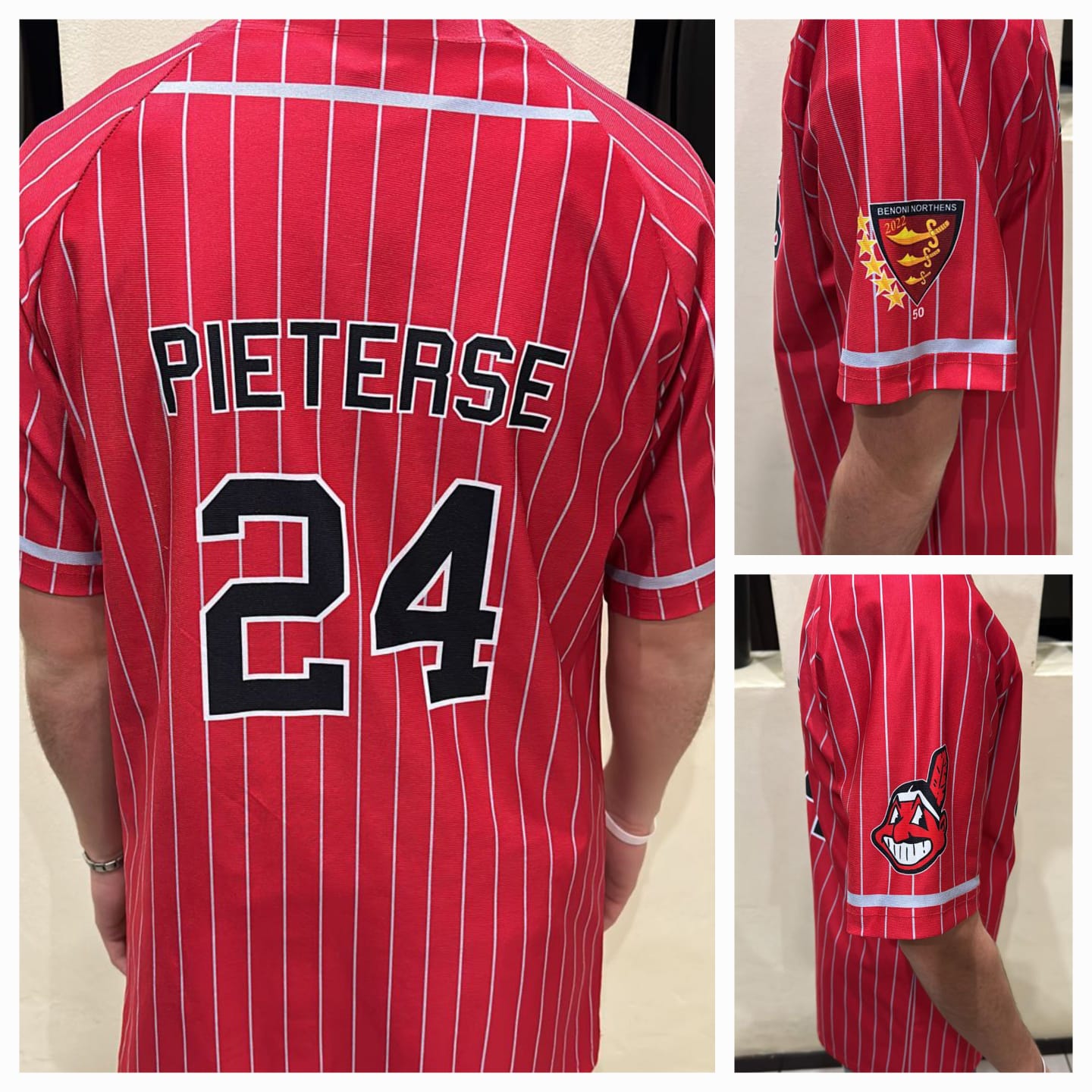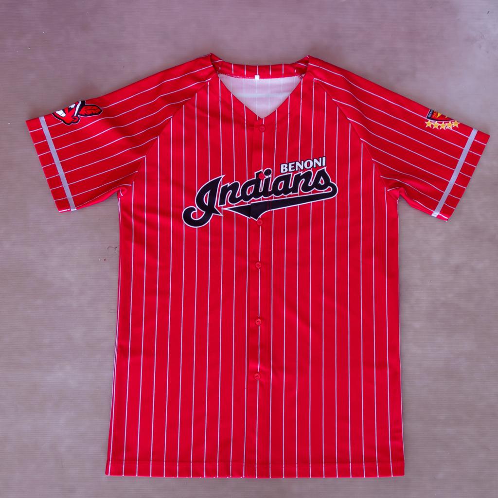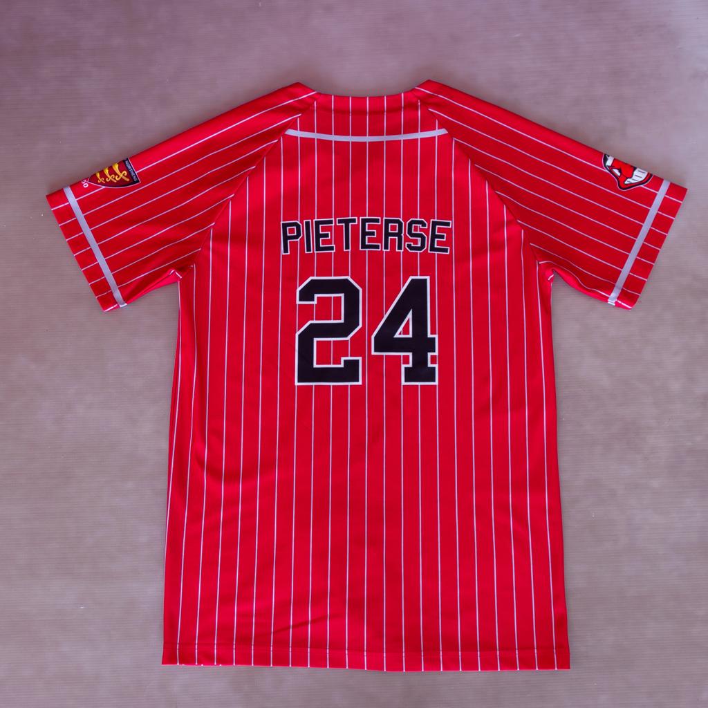 Red, white-striped, button-up uniform shirt used for game days. Includes player name and number printed on the shirt.